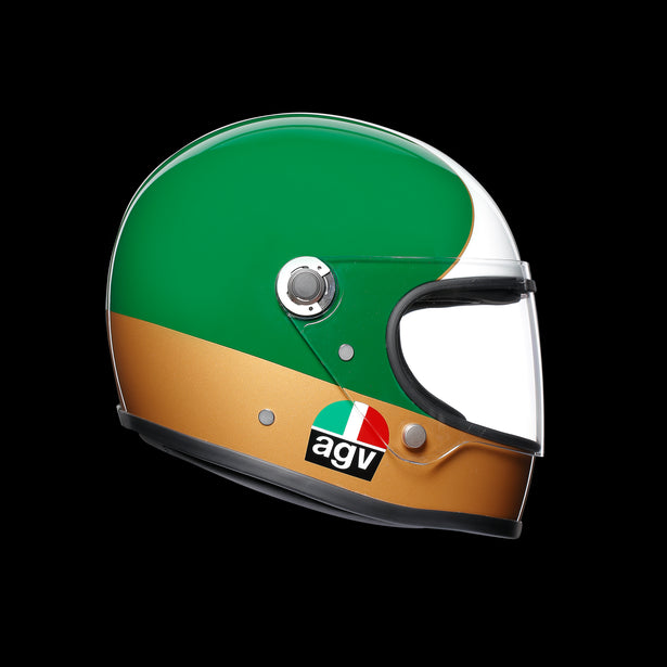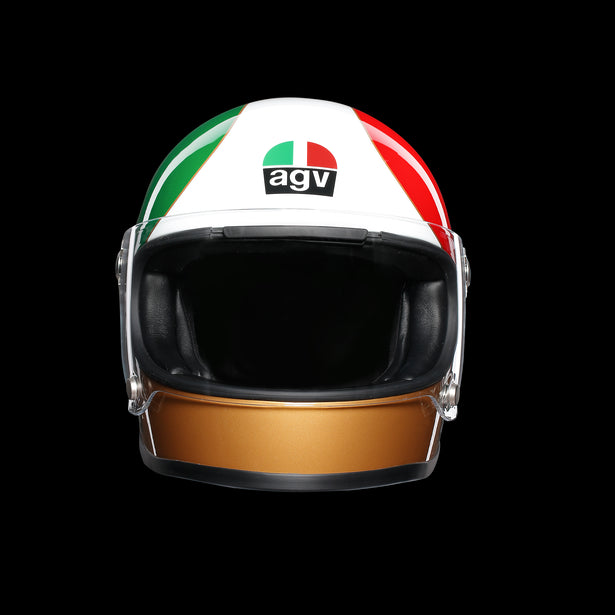 The tricolor Agostini helmet, seen from behind, just as his rivals saw it. Same shape, same color scheme, the same leather bag used to transport it, modern technology. Timeless allure in just 3000 limited pieces.